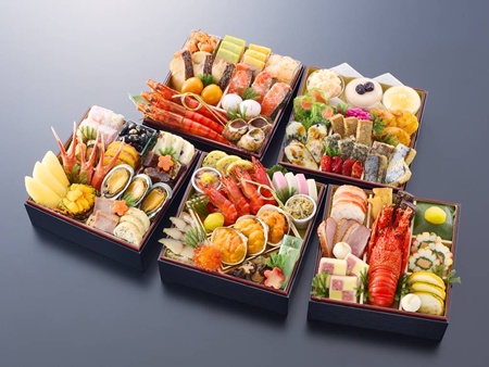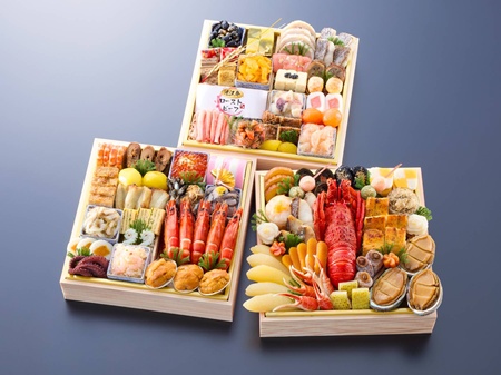 テレビでおなじみ、浪花のカリスマシェフ林裕人監修の華やかさ際立つ白木の船形特大重。 「祝い鯛「ロブスター旨煮」「蟹味噌甲羅盛り」など豪華食材をふんだんに使用した54品目のバラエティ豊かなおせちです。