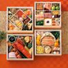 トリュフ入りレーズン松風/赤魚西京焼/海老旨煮/葉付き金柑/炙り烏賊の翡翠味噌掛け/鰤照焼/伊達巻柚子風味/手毬餅/五郎島金時の渋皮栗きんとん/田作りカシューナッツ和え/数の子醤油漬/鮑生姜煮/だし若布/いくらなます/くるみ飴炊き