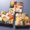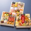 【一の重と同じ内容の二段重】伊達巻き/若鶏五香焼き/たたきごぼう/にしん土佐煮/紅蒲鉾/穴子ひしお焼き/蛍烏賊含め煮/湯葉生姜煮/鰤大根/高野豆腐の含め煮/隠元/鰆昆布〆/いくら醬油漬け/紅白なます/金箔黒豆/甘栗甘露煮/さつまいも金団/鰆黄金焼き/たこ柔らか煮/田作り/数の子醬油漬け/三色団子串/あわび福良煮/絹さや/鮭味噌焼き/紅鮭砧巻き/海老艶煮/蒸し羊羹白友禅包み/梅花人参含め煮