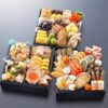 金箔黒豆/鮭松前/六角黄金焼き/ほうじ茶と小豆のクリームチーズわらび餅添え/にしん甘露煮/金平糖/さつまいも蜜煮/赤海老雲丹和え/ずわい蟹爪含め煮/手まり餅/帆立明太/数の子美味漬け/松前漬け/紫白しぼり/鮭幽庵焼き/紅白梅かんざし/赤魚からすみ焼き/たら旨煮/小海老蜜煮/甘栗甘露煮