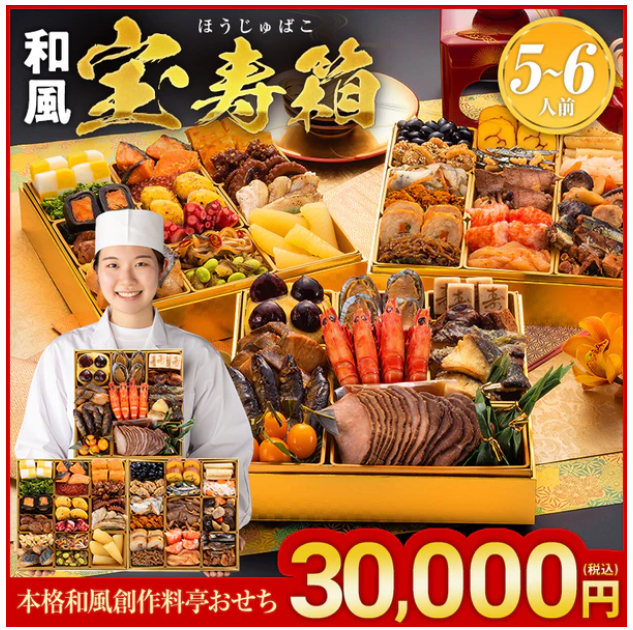 鮑旨煮/車海老旨煮/子持鮎甘露煮/銀鱈味噌焼/うまかぶり照焼/黒毛和牛ローストビーフスライス/ジャポネソース/牛肉しぐれ包み/豚角煮/寿高野豆腐/渋皮栗甘露/金団/葉付金柑