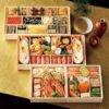 北海道産桜ますの柚庵焼き/噴火湾産ぶりハム ハーブ風味/北海道産鶏卵の伊達巻/北海道産にしん昆布巻/北海道産ボイル北海しまえび/北海道産黒豆の煮物/北海道産明太子の揚げかまぼこ/北海道産とうもろこしの揚げかまぼこ/七飯産王様しいたけ入り旨煮/北海道産大豆の湯葉