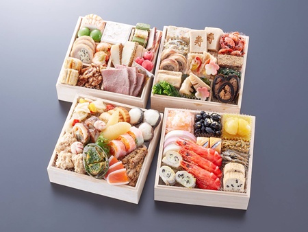 はな切り大根のハリハリ漬/裏白しいたけ/たたきごぼう/小川巻/鰤の子煮/ころ手まり麩/伊達巻/数の子美味漬/彩りきぬた巻き/あわびのパセリバター焼/牛旬菜巻