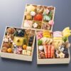 紅白なます/金箔黒豆/栗きんとん(甘露栗2個)/市松かまぼこ/きびなご手綱/ちりめん青菜炒め煮/太刀魚ずんだ餡包み焼/浜汐海老/田作り/東寺巻