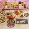 いわしのから揚げ/ごぼう穴子印籠/にしん昆布巻/寿高野豆腐/有頭海老の艶煮/たたきごぼう/煮しめしいたけ/たこの旨煮/鮭といくらの石狩漬/くるみ甘露煮/花餅紅梅/国産豚肉ごぼう巻/コハダの粟漬け
