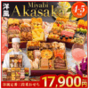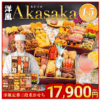 伝統の「和」、華やかな「洋」、深い味わいの「中華」の3つの食文化が融合した贅沢な大人数用の豪華な和洋中おせち。幅広い世代の家族みんなが喜ぶおせちです。見た目が非常に美しく、お雑煮用のスープ付きで便利です。博多久松 三段重おせち「祝赤重」のお品書き