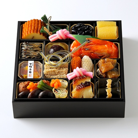 数の子醤油漬、黒豆甘露煮、巾着餅、伊達巻、海老の旨煮、栗きんとん、田作り、鱈の旨煮、紅白松笠烏賊、叩き牛蒡、紅白なますいくら添え、にしん昆布巻、からす鰈西京焼、湯葉俵、梅人参、三度豆煮、飛龍頭煮、椎茸旨煮、千代結び蒲鉾