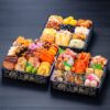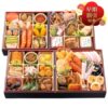 数の子醤油漬、黒豆甘露煮、巾着餅、伊達巻、海老の旨煮、栗きんとん、田作り、鱈の旨煮、紅白松笠烏賊、叩き牛蒡、紅白なますいくら添え、にしん昆布巻、からす鰈西京焼、湯葉俵、梅人参、三度豆煮、飛龍頭煮、椎茸旨煮、千代結び蒲鉾