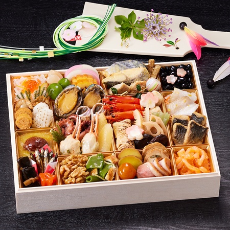 いくら醤油漬、紅白なます、白花豆煮、若桃甘露煮、紅白蒲鉾、伊達巻、さわら西京焼、小鯛塩焼、たたき牛蒡、手まり餅、梅百合根羊羹、黒豆煮、焼帆立、たらこ旨煮、松笠いか白焼、あわび煮、帆立黄金和え、味付バイ貝、牛しぐれ笹包み、海老の旨煮、鶏つくね柚子味、梅麩含め煮、のどぐろ柚子酢漬、渋皮栗甘露煮、きんとん、紅ズワイ蟹爪団子、蛸煮付け、味付数の子、焼湯葉巻、穂先筍の含め煮、ふきの旨煮、味付蓮根、椎茸旨煮、にしん黒酢南蛮漬、田作り煮、一口昆布巻、味付花こんにゃく、くるみ甘露煮、万願寺唐辛子と焼京揚の生姜醤油和え、さつま芋甘露煮、金柑甘露煮、鶏野菜巻、合鴨スモーク、いか雲丹和え