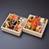 いくら醤油漬、紅白なます、白花豆煮、若桃甘露煮、紅白蒲鉾、伊達巻、さわら西京焼、小鯛塩焼、たたき牛蒡、手まり餅、梅百合根羊羹、黒豆煮、焼帆立、たらこ旨煮、松笠いか白焼、あわび煮、帆立黄金和え、味付バイ貝、牛しぐれ笹包み、海老の旨煮、鶏つくね柚子味、梅麩含め煮、のどぐろ柚子酢漬、渋皮栗甘露煮、きんとん、紅ズワイ蟹爪団子、蛸煮付け、味付数の子、焼湯葉巻、穂先筍の含め煮、ふきの旨煮、味付蓮根、椎茸旨煮、にしん黒酢南蛮漬、田作り煮、一口昆布巻、味付花こんにゃく、くるみ甘露煮、万願寺唐辛子と焼京揚の生姜醤油和え、さつま芋甘露煮、金柑甘露煮、鶏野菜巻、合鴨スモーク、いか雲丹和え