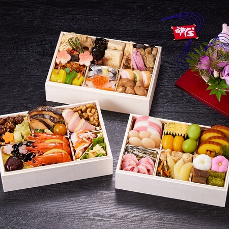 紅白蒲鉾、白花豆煮、九条葱入り玉子焼、杏子煮、若桃甘露煮、伊達巻、田作り煮、くわい梅和え、小鯛西京焼、味付数の子、松前漬、白梅餅、紅梅餅、さつま芋甘露煮、黒糖わらび餅、抹茶わらび餅
