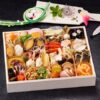 紅白蒲鉾、白花豆煮、九条葱入り玉子焼、杏子煮、若桃甘露煮、伊達巻、田作り煮、くわい梅和え、小鯛西京焼、味付数の子、松前漬、白梅餅、紅梅餅、さつま芋甘露煮、黒糖わらび餅、抹茶わらび餅