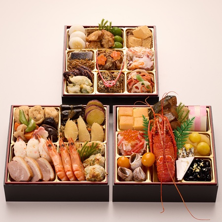 伊達板×4、ぶり照焼×3、たたき牛蒡胡麻和え20g、紅白市松蒲鉾×3、紅白なます35g、いくら醤油漬5g、ボイルロブスター、鳴門金時芋きんとん50g、栗甘露煮×3、金柑さわやか煮×2、バイ貝旨煮×3、田作り5g、黒豆(あしらい金箔)40g