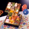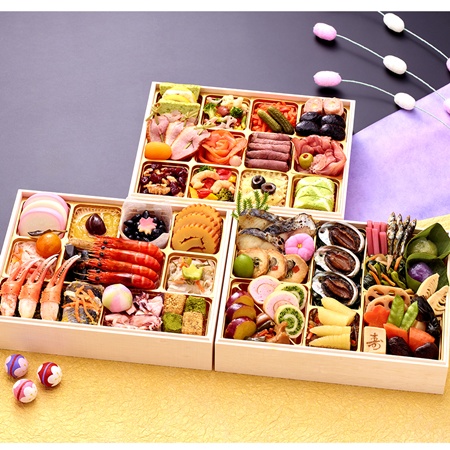 かまぼこ(紅)、かまぼこ(白)、たたきごぼう、にしん昆布巻、きんとん、渋皮栗甘露煮、伊達巻、黒豆煮、桜色麩、紅白なます、金柑甘露煮、祝海老、柚子かぶら、竹麩、ボイル昆布、かに爪、にしん甘酢漬、酢たこ、てまり餅、わらび餅きなこ、わらび餅抹茶
