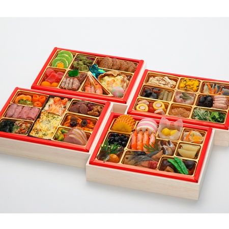 伊達巻、かまぼこ(赤)、かまぼこ(白)、さつま芋きんとん、栗甘露煮、彩り大根なます、とびっこ黄金、黒豆煮、有頭中むき海老、バイ貝旨煮、菜の花松前、味付け数の子、いわし田作り、葉付金柑、鮭幽庵焼、蓮の芽梅酢漬、人参旨煮、蓮根旨煮、椎茸旨煮、きぬさや