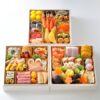紅白市松かまぼこ/若桃甘露煮/丸十レモン煮/牛笹巻/ホタテ照焼/ぶり照焼/伊達巻/巻き湯葉/梅麩煮/棒だら/一口昆布巻/あわび柔らか煮/合鴨ロース/金柑甘露煮/かつおくるみ/梅貝旨煮/寿カステラ/芋きんとん/栗甘露煮/海老艶煮/いくら醤油漬/紅白なます/味付数の子/れんこん柚子マリネ/黒豆煮