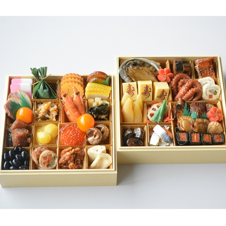 1.紅白かまぼこ/2.若桃甘露煮/3.牛笹巻/4.梅貝旨煮/5.伊達巻/6.かつおくるみ/7.丸十レモン煮/8.合鴨ロース/9.いか黄金焼/10.帆刺黄金松前/11.花百合根甘露/12.海老艶煮/13.金柑甘露煮/14.たたき牛蒡/15.一口昆布巻/16.棒だら/17.栗甘露煮/18.芋きんとん/19.いくら醤油漬/20.紅白なます/21.れんこん柚子マリネ/22.黒豆煮/23.鶏梅ごぼう巻/24.ぶりの照焼/25.田作り