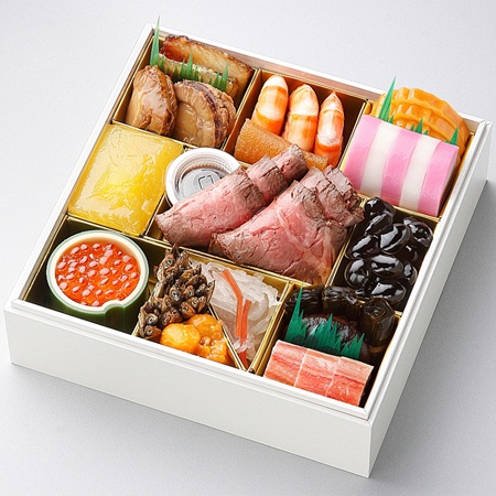 紅白小袖蒲鉾、伊達巻、海老芝煮、数の子鼈甲漬、黒豆、田作り、貝柱雲丹和え、紅白なます、栗きんとん、いくら醤油漬、ローストビーフ、タレ(ローストビーフソース)、蟹真丈、干椎茸甘露煮、一口昆布巻、鰈西京焼、帆立生姜煮