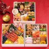 紅白小袖蒲鉾、伊達巻、海老芝煮、数の子鼈甲漬、黒豆、田作り、貝柱雲丹和え、紅白なます、栗きんとん、いくら醤油漬、ローストビーフ、タレ(ローストビーフソース)、蟹真丈、干椎茸甘露煮、一口昆布巻、鰈西京焼、帆立生姜煮