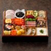 紅白なます いくら添え、金箔黒豆、栗きんとんと甘露栗、田作り、カラスガレイ西京焼、市松かまぼこ、伊達巻、たたきごぼう、浜汐海老、数の子美味漬、葉わさび松前漬、鰊昆布巻、裏白しいたけ、笹しぐれ、豚八幡巻