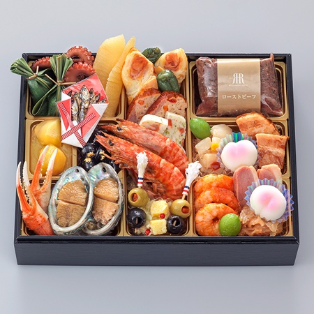 ゆで蛸の照焼/牛肉の笹包み/味付数の子/栗きんとん/黒豆煮 金粉飾り/ごまめ(のし袋入)/紅白なます/蟹爪の甘酢漬/殻付煮あわび/豚肉のやわらか煮/ボロニアソーセージのパイ包み焼/鶏肉のガランティーヌ/サーモン入り野菜のテリーヌ/白身魚のアクアパッツァ風/車海老のガーリックバター焼/魚卵とドライフルーツのサラダ/2色のオリーブピック/ローストビーフ/若桃のシラップ漬/飴掛けアーモンド/合鴨肉のスモーク/胡瓜のゆずマリネ/いかの中華風マリネ/花餅/海老のチリソース和え/中華くらげ