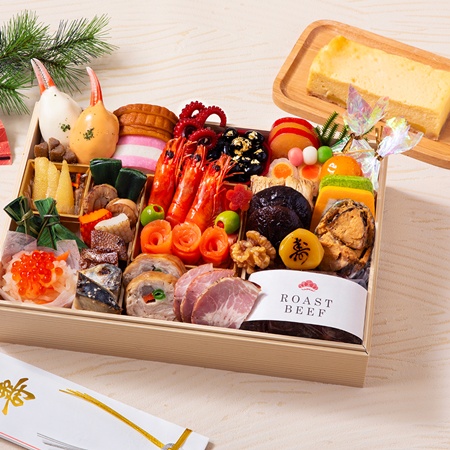 蟹つめオーロラ風/蟹つめマヨネーズ風/たたきごぼう/伊達巻/赤蒲鉾/白蒲鉾/蛸の柔らか煮/黒豆煮/鳴門金時のレモン煮/日の出きぬた巻/金柑シロップ煮/オーロラクリーム包み/三色団子串/味付け数の子/松前漬け/焼き帆立/いか短冊白焼き/いか短冊雲丹焼き/昆布巻/笹餅串着よもぎ/紅白なます柚子風味/北海道いくら/ぶりの照り焼き/鮭の西京焼き/海老の旨煮/オニオンマリネ/スモークサーモンローズ/グリーンオリーブ/若鶏の三色巻/ローストポーク/焼き湯葉巻/椎茸煮/海老とブロッコリーのテリーヌ/サーモンキャロットテリーヌ/鰆の雲丹味噌焼き/寿マロン/くるみの甘露煮/梅型金時人参/ローストビーフ