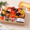 ぶり照焼、オクラの浅漬、焼き湯葉巻、鰊昆布巻、松前漬、数の子、有頭海老、華味鳥ももの炭火焼、鳴門金時芋レモン煮、真鱈子旨煮、糸昆布酢炊き、明太子昆布〆、華味鳥の鶏皮