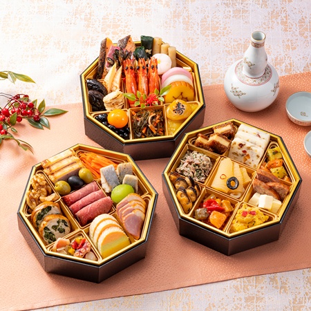田作り煮、紅鮭西京焼、昆布巻、たたきごぼう、花餅、椎茸煮、焼筍煮、焼湯葉煮、海老の旨煮、伊達巻、紅蒲鉾、白蒲鉾、黒豆、金柑、松前漬、きんとん、寿栗