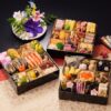 田作り煮、紅鮭西京焼、昆布巻、たたきごぼう、花餅、椎茸煮、焼筍煮、焼湯葉煮、海老の旨煮、伊達巻、紅蒲鉾、白蒲鉾、黒豆、金柑、松前漬、きんとん、寿栗