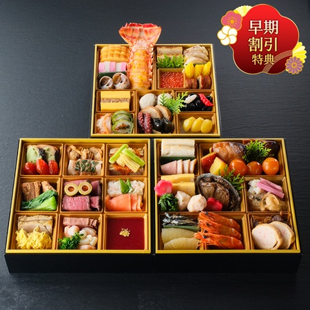伊達巻/紅白蒲鉾/バイ貝旨煮/ロブスターテール山吹和え/鶏味噌松風/鯛の献珍焼/烏賊の黄金焼/穴子の八幡巻き/紅鮭いくら敷きとろろ/三色錦玉子/紅白柚香なます/鯛の広島菜巻き/裏白椎茸/鶏の八幡巻/蛸足やわらか煮/一口昆布巻/黒豆 紅白千代呂木添え/金団・栗甘露煮