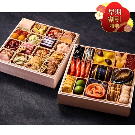 黒豆煮、田作り、海老含め煮、九条葱卵焼き、青桃甘露煮、きんとん、栗甘露煮、渋皮栗煮、十勝ハーブ牛ローストビーフと赤ワインソース、にしん昆布〆、オニオンマリネとドライクランベリー、スモークサーモントラウト バラ造り、味付数の子、味付イクラ、わかめ中華風味、鮑醤油煮、たたき牛蒡、いか松笠白焼