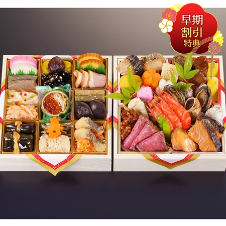 かまぼこ(紅白)、綱蒟蒻、栗きんとん渋皮栗、黒豆、伊達巻、合鴨ロース、たたき牛蒡、椎茸煮、なます、いくら、烏賊柚子ジュレ、いか明太和え、鯛南蛮漬け、湯葉煮、ごまめ、昆布巻、寿人参