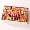 【山幸の重 22品】たたきごぼう、椎茸田舎煮、牡丹百合根、寿羽子板筍、伊達巻、栗豚のロースト、豚タンのシーズニングロースト、生ハムチーズ串、牛タンのシーズニングロースト、照焼チキンステーキ、ローストビーフ、花形紅白こんにゃく煮、日向夏なます、菊花蕪、栗入りきんとん、かつおくるみ、黒豆松葉刺し、青梅甘露、梅麩甘煮、ロマネスコカリフラワーのバジル風味、梅麩甘煮、カスタードのオーロラ包み、ショコラテリーヌ