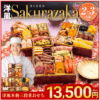 味付け数の子/海の香蒲鉾/ほたて真砂和え/真鱈子昆布/鮪金胡麻角煮/にしん酢漬け/いかサラダ/牛肉牛蒡しぐれ煮/鶏つくね照焼/たたき牛蒡/菜の花のお浸し/大根焙煎胡麻サラダ/栗甘露煮/金団/黒豆蜜煮/市松錦玉子/胡麻胡桃