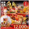 小家族で過ごすお正月におすすめの和洋折衷定番おせち。定番だけでなく珍しい料理も入っている和洋折衷のおせちが食べたい方や甘いものが好きな方におすすめの通常の6.5寸よりも大きな特大8寸のお重に入った彩り鮮やかなおせちです。彩り豊かで、子どもにも食べやすい味付けで品数も充実で家族みんなで楽しめるおせちを探している方におすすめです。博多久松 二段重おせち「春日」のお品書き