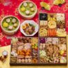 金箔黒豆/田作り/栗きんとん/鰤塩麹焼/かつをくるみ/鶏の柚子味噌/市松かまぼこ/八幡巻/手まり麩/鰊昆布巻/数の子美味漬/浜汐海老/伊達巻