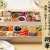 金箔黒豆/田作り/栗きんとん/カラスガレイ西京焼/海老しいたけ/裏白しいたけ/手まり麩/数の子美味漬/豚八幡巻/伊達巻/浜汐海老