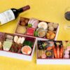 真鱈子旨煮/寿高野豆腐/豚角煮/白身魚のエスカベッシュ/烏賊魚卵射込/焼き帆立/鰆西京焼き/赤魚南蛮漬/ままかり酢漬け柚子風味/海老紅白奉書/蛸小倉煮/はかた地どりのテリーヌ/牛肉とごぼうしぐれ煮/紅白結び餅