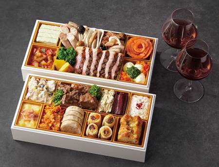 スモークサーモンとクリームチーズのカナッペ/ごぼうのブラッサート/チキンハニーマスタード/牛肉の赤ワイン煮/豚肉のローストポルチーニクリームソース/きのことのケーキサレ/洋風栗きんとんのクレープ包み/鶏もも肉のミートローフ仕立て/トリッパ/アップルバターのプロシュート添え