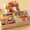 ヤリイカのエスカベッシュ/つぶ貝ときくらげの新丈/白きくらげときゅうりの和風マリネ/数の子美味漬/鯵の彩り金紙巻/フルーツチーズ/Xビーフのローストビーフ(ソース付)/うに二見焼/海老チリソース/サーモン重ね焼/梅花人参/ブリの子旨煮/帆立貝さんしょう煮/のどぐろかけぽん漬/うーじ糖とくるみのケーキ/にしん昆布巻/小海老の甘露煮