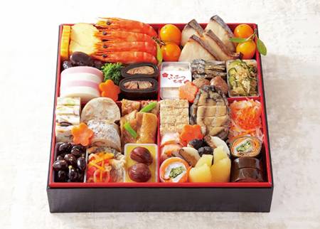 山吹きんかん/寒さわら塩麹味噌焼/海老塩茹で/伊達巻/白きくらげときゅうりの中華風マリネ/香りごまめ/フルーツチーズ/梅花人参/にしん昆布巻/菜の花福良漬/花豆煮/合鴨つくね照り煮/紅白かまぼこ/紅白なます(いくら添え)/あわび煮/4Xチキンの松風/4Xチキンのくわ焼/小鯛ごぼう巻/つぶ貝ときくらげの新丈/カンパチ龍皮巻/裏白しいたけ/小鯛笹巻/五郎島金時のきんとん/栗渋皮煮/鯵の南蛮漬/金箔黒豆/数の子美味漬