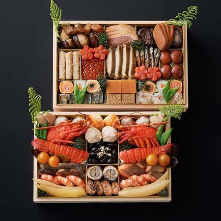 1.たら煮・裏白椎茸煮 2.合鴨山椒風味 3.にしん昆布巻・からすみ 4.ごぼう胡麻和え 5.味付いくら・金時梅人参煮 6.黒あわび醤油煮 7.田作り煮・金時梅人参煮 8.きんとん・渋皮栗甘露煮 9.サーモントラウト錦糸巻・鯛昆布巻・サーモントラウト砧巻・黒かじき昆布〆・きぬさや煮 10.カステラ玉子・鶏松風 11.サーモントラウト砧巻・鯛昆布巻・サーモントラウト錦糸巻・菊かぶら・柚子かぶら