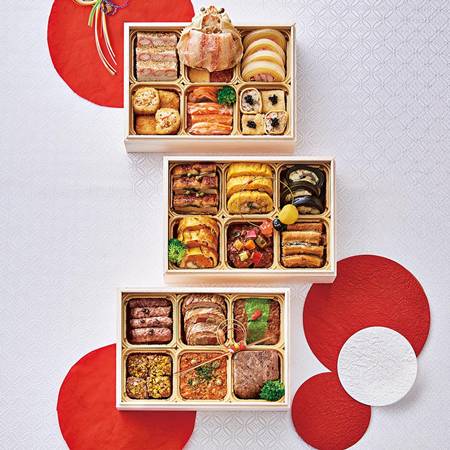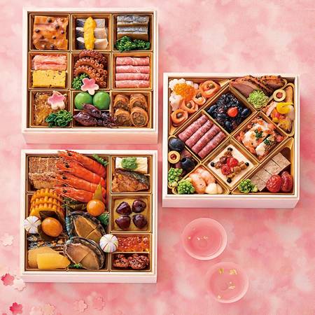 和・洋・和三段重「桜」は、選りすぐりの美味を堪能して和の重と洋の重をたっぷり楽しめる三段重。お正月らしく、和の食材を存分にご堪能いただけるよう、一段目、三段目に和の食材が詰まっていて、二段目には、華やかな洋風の食材が入っています。 シーンに合わせて洋の重は年末の乾杯のお供に、和の重は、お正月にと様々な楽しみ方ができる日本酒やワインと相性の良い品目を盛り込んだ、ボリューム満点の大満足の三段重おせちです。